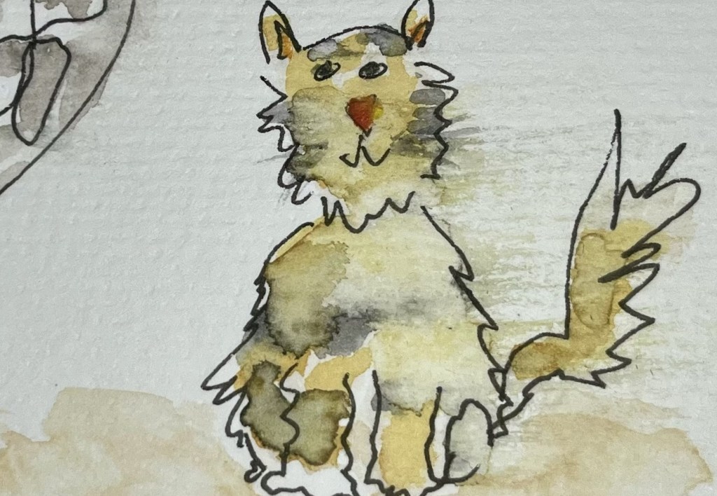 In this painting, I wanted to give the illusion of the cats fur being blown by the fan. So once I’d painted the impression of fur, I added a little water to it and then quickly wiped it sideways using a tissue. This tiny added detail made all the difference in adding context to the illustration.